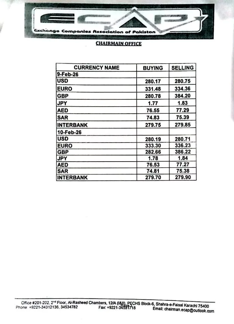 کاروباری ہفتے کے دوسرے دن انٹربینک میں ڈالر کی قیمت 3 پیسے کم ہوئی اور یوں یہ 279 روپے 67 پیسے پر آ کر بند ہوا۔اوپن مارکیٹ میں بھی ڈالر کی قدر میں معمولی کمی ریکارڈ کی گئی، جہاں امریکی کرنسی 4 پیسے سستی ہو کر 280 روپے 71 پیسے کی سطح پر پہنچ گئی۔اس کے برعکس یورپی اور برطانوی کرنسیاں مہنگی ہو گئیں۔ اوپن مارکیٹ میں یورو کی قیمت میں 1 روپے 87 پیسے کا اضافہ ہوا جس کے بعد یہ 336 روپے 23 پیسے کا ہو گیا، جبکہ برطانوی پاؤنڈ 2 روپے 2 پیسے بڑھ کر 386 روپے 22 پیسے پر فروخت ہوتا رہا۔دوسری جانب خلیجی کرنسیوں میں ملا جلا رجحان سامنے آیا۔ متحدہ عرب امارات کا درہم 2 پیسے سستا ہو کر 77 روپے 27 پیسے جبکہ سعودی ریال 1 پیسہ کمی کے بعد 75 روپے 38 پیسے پر آ گیا۔