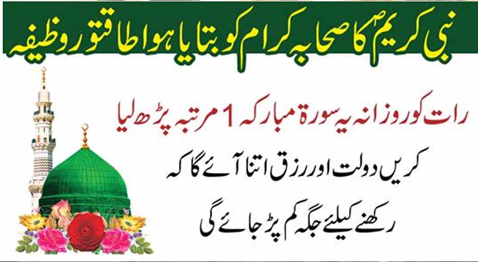 ہی مجھے پتہ چلا کہ آپ نے میری تنخواہ بند کردی تو میں نے گھر میں بچیوں سے جا کر بتایا کہ یہ حضورنبی اکرم ﷺ کا بتایا ہواعمل ہے کوئی معمولی چیز نہیں سورہ واقعہ پڑھو اللہ اس کی برقت سے مجھے روزے دے رہے ہیں تم نے اپنا دروازا بند کیا لیکن اللہ نے تو نہیں بند کیا وہ دروازا توکھلا ہے توآپ گھر کے اندر تمام افراد مل کر جو بھی قرآن پاک پڑھا ہوا ہے سورہ واقعہ رات کو پڑھ لیا کریں آپ مغرب کے بعد پڑھ لیں عشاء کے بعد پڑھ لے رات کو سونے سے پہلے پڑھ لیں آپ یہ معمول بنا لیں گے تو انشاء اللہ تعالی آپ کے گھروں کے اندر رزق کی تنگی کبھی بھی نہیں ہوگی اوردوسری بات یہ سمجھے جو بات آدمی کہتا ہے اس بات پراس کا عمل ہوتواس کا فائدہ بھی زیادہ ہے ایک تو قرآن پاک پڑھنے کا ثواب وہ تو مستقل ہے ہی ہے. دس گناہ معاف ہوتے ہیں دس درجات بلند ہوتے ہیں اورنام اعمال میں دس نیکیاں لکھ دی جاتی ہیں اوراس کے ساتھ ساتھ اللہ دنیا کی پریشانی کو بھی دورکردیتے ہیں آپ اپنے بچوں سے بھی کہیں اس سورہ کو پڑھنے کے لئے اور خود بھی پڑھیں یہ نہیں کے گھر میں صرف ایک آدمی ہی پڑھ رہا ہے سارے پڑھیں اگرایک آدمی پڑھے گا تواس کا بھی فائدہ ہے لیکن اگر سارے گھر کے پڑھیں گے تواس کا اورفائدہ بڑھ جائے گا اس لئے اس وظیفہ پراس لئے عمل کریں کہ یہ وظیفہ ہمارے پیارے بھیﷺ کا بتایا ہوا ہے عام آدمی کا بتایا ہوا نہیں ہے اور میں آمید کرتا ہوں آپ سب اس پرعمل کو ظرورکریں گے اوراس وظیفہ کوزیادہ سے زیادہ شئیربھی کریں گے جوجو بھی آپ کی یہ بات سن کرعمل کریں گے ان کا بھی فائدہ ہوگا اورآپ کا بھی فائدہ ہوگا انسان لالچی ہے دنیا کے فائدے کے لئے تولالچ کرتا ہے آخرت کے فائدے کے لئے لالچ کرو جو فائدہ ہمیشہ کے لئے ہے دنیا میں کچھ مل بھی گیا توعارضی کے لئے ہے اس لیے یہی اللہ تعالی سے مانگیں کہ اللہ دنیا میں بھی اپنی نعمتوں سے سرفرازفرما اورآخرت کی نعمتوں سے بھی مالامال فرما
