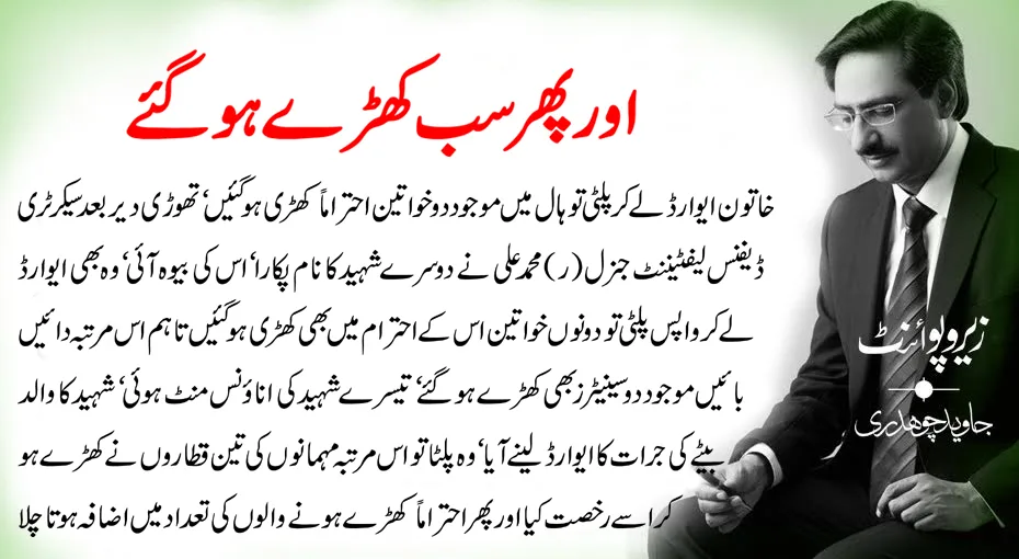 خاتون ایوارڈ لے کر پلٹی تو ہال میں موجود دو خواتین احتراماً کھڑی ہو گئیں‘ تھوڑی دیر بعد سیکرٹری ڈیفنس لیفٹیننٹ جنرل(ر) محمد علی نے دوسرے شہید کا نام پکارا‘ اس کی بیوہ آئی‘ وہ بھی ایوارڈ لے کر واپس پلٹی تو دونوں خواتین اس کے احترام میں بھی کھڑی ہو گئیں تاہم اس مرتبہ دائیں بائیں موجود دو سینیٹرز بھی کھڑے ہو گئے‘ تیسرے شہید کی انائونس منٹ ہوئی‘ شہید کا والد بیٹے کی جرات کا ایوارڈ لینے آیا‘ وہ پلٹا تو اس مرتبہ مہمانوں کی تین قطاروں نے کھڑے ہو کر اسے رخصت کیا اور پھر احتراماً کھڑے ہونے والوں کی تعداد میںاضافہ ہوتا چلا گیا یہاں تک کہ چھٹے شہید کی بیوہ کے بعدشہیدوں کے ہر وارث کا پورے ہال نے کھڑے ہو کر استقبال کیا‘ یہ ایوان صدر میں نئی روایت تھی‘ مجھے ایوان صدر میں متعدد تقریبات میں شرکت کا اتفاق ہوا‘ صدر ہائوس کا ایک پروٹوکول ہے اور اس میں شرکاء صرف تین وقت اپنی نشستوں سے کھڑے ہوتے ہیں‘