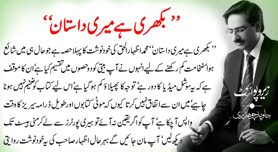 ’’بکھری ہے میری داستان‘‘ محمد اظہارالحق کی خود نوشت کا پہلا حصہ ہے جو حال ہی میں شائع ہوا‘ضخامت کم رکھنے کے لیے انہوں نے آپ بیتی کو دو حصوں میں تقسیم کیا ہے‘ ان کا موقف ہے کہ یہ سوشل میڈیا کا دور ہے‘ توجہ کا پھیلاؤ کم ہو گیا ہے‘ اس لیے کتاب کو ضخیم نہیں ہونا چاہیے‘ میں ان سے اتفاق نہیں کرتا کیوں کہ موٹی کتابوں اور طویل ڈرامہ سیریز کا وقت واپس آ چکا ہے‘ آپ کو اگر یقین نہ آئے تو ہیری پورٹرز سے لے کر منی ہیسٹ تک دیکھ لیں‘ آپ مان جائیں گے بہرحال اظہار صاحب کی یہ خود نوشت روایتی خود نوشت نہیں ہے‘ انہوں نے اکبر الہ آبادی کی بتائی ہوئی اس ترتیب کو مکمل طور پر نظر انداز کیا ہے’’بی اے کیا‘ نوکر ہوئے‘ پنشن ملی‘ پھر مر گئے‘‘۔اکثر خود نوشتیں اس طرح لکھی جاتی ہیں جیسے تاریخ میں بادشاہوں کا حال لکھا ہوتا ہے‘ پیدائش‘ لڑکپن جوانی اور پھربڑھاپا۔