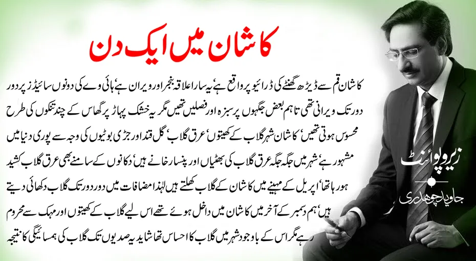 کاشان قم سے ڈیڑھ گھنٹے کی ڈرائیو پر واقع ہے‘ یہ سارا علاقہ بنجر اور ویران ہے‘ ہائی وے کی دونوں سائیڈز پر دور دور تک ویرانی تھی تاہم بعض جگہوں پر سبزہ اور فصلیں تھیں مگر یہ خشک پہاڑ پر گھاس کے چند تنکوں کی طرح محسوس ہوتی تھیں‘