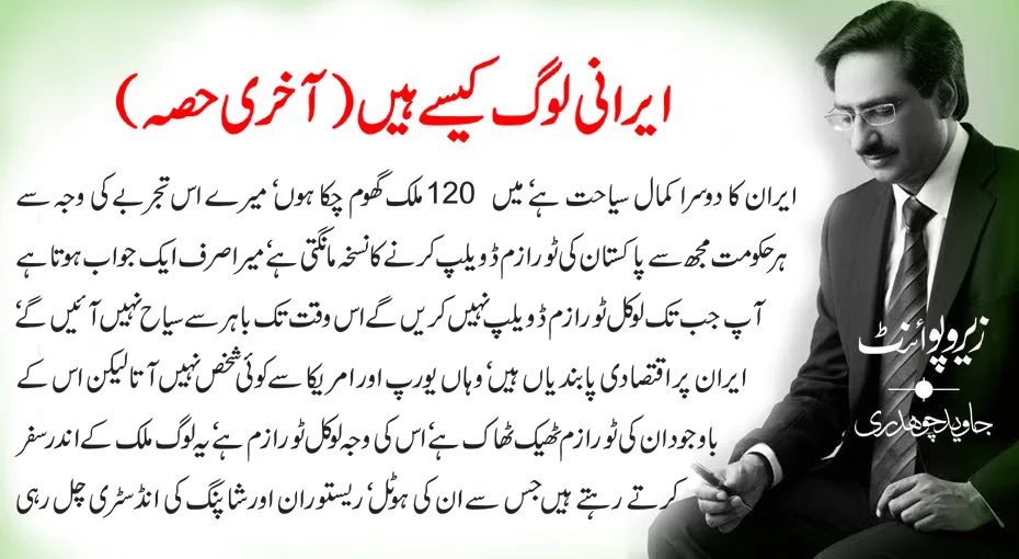ایران کا دوسرا کمال سیاحت ہے‘ میں 120 ملک گھوم چکا ہوں‘ میرے اس تجربے کی وجہ سے ہرحکومت مجھ سے پاکستان کی ٹورازم ڈویلپ کرنے کا نسخہ مانگتی ہے‘ میرا صرف ایک جواب ہوتا ہے آپ جب تک لوکل ٹورازم ڈویلپ نہیں کریں گے اس وقت تک باہر سے سیاح نہیں آئیں گے‘ ایران پر اقتصادی پابندیاں ہیں‘ وہاں یورپ اور امریکا سے کوئی شخص نہیں آتا لیکن اس کے باوجود ان کی ٹورازم ٹھیک ٹھاک ہے‘ اس کی وجہ لوکل ٹورازم ہے‘ یہ لوگ ملک کے اندر سفر کرتے رہتے ہیں جس سے ان کی ہوٹل‘ ریستوران اور شاپنگ کی انڈسٹری چل رہی ہے‘ چھٹیوں کے دنوں میں ہائی ویز‘ ہوٹلوں اور ریستورانوں میں جگہ نہیں ملتی‘ ہم بھی اگر اپنی سیاحتی انڈسٹری کو پروان چڑھانا چاہتے ہیں تو ہمیں لوکل ٹورازم پر توجہ دینی ہو گی‘حکومت کو چاہیے یہ ہوٹلوں اور ریستورانوں کے لیے باقاعدہ پالیسی بنائے‘ ہر شہر میں سیاحتی مقامات کے لیے جگہیں مختص کر دے اورسرمایہ کاروں کی ان جگہوں پر تعمیرات کے لیے حوصلہ افزائی کرے‘ہماری سیاحت چند برسوں میں قدموں پر کھڑی ہو جائے گی‘ ایران میں لاء اینڈ آرڈر بہت اچھا ہے‘ سٹریٹ کرائمز اور ہراسانی کے واقعات نہ ہونے کے برابر ہیں چناں چہ لوگ ہر شام گھروں سے باہر نکلتے ہیں جس کی وجہ سے کافی شاپس‘ چائے خانوں اور ریستورانوں کی انڈسٹری چل رہی ہے‘ ہم بھی یہ کر سکتے ہیں تاکہ زیادہ سے زیادہ لوگ گھروں سے باہر نکلیں‘ اس سے بھی معاشی پہیہ چل پڑے گا‘ حکومت رات آٹھ بجے شاپنگ سنٹر بند کرا دے لیکن ریستوران اور کافی شاپس رات دو بجے تک کھلی رہیں‘ اس سے سماجی اور اقتصادی دونوں تبدیلیاں آئیں گی۔ ایرانی بھی پاکستانیوں کی طرح غیر مطمئن لوگ ہیں‘ ہم جس طرح ہر حکومت اور ہر نظام کے خلاف ہیں‘ ہم جمہوری ادوار میں فوج کو یاد کرتے ہیں اور جب فوج آ جاتی ہے تو ہم جمہوریت کی بحالی کی تحریکیں شروع کر دیتے ہیں بالکل اسی طرح ایرانی بھی ہر نظام کے خلاف ہیں‘ ان لوگوں نے بڑی قربانیوں سے شاہ ایران سے جان چھڑائی لیکن یہ اب دوبارہ شاہ کے زمانے کی آزادیوں کے لیے جدوجہد کر رہے ہیں‘ یہ ملک میں رقص خانے (ڈسکوز)‘ شراب خانے اور مکمل یورپی لباس چاہتے ہیں‘ میرا مشاہدہ ہے یہ لوگ جس دن اس میں کام یاب ہو جائیں گے یہ اگلے ہی دن دوبارہ اسلامی انقلاب کے لیے مارچ شروع کر