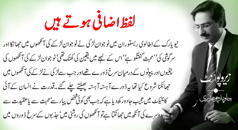 ہوتی تو بھی یہ صرف آنکھ کے ذریعے اپنے تمام جذبے‘ اپنے سارے احساسات اور اپنی ساری ضرورتیں دوسروں تک ’’کمیونی کیٹ‘‘ کر دیتا۔ انسان دنیا کی ہر چیز سے چھپ سکتا ہے لیکن اپنی آنکھ میں الف ننگا ہوتا ہے۔ میں واپس نیویارک کے اطالوی ریستوران کی طرف آتا ہوں۔ لڑکی‘ لڑکی تھی چناںچہ وہ دنیا کی تمام لڑکیوں کی طرح گفتگو کو محبت سمجھ رہی تھی۔ اس کا خیال تھا محبت اظہار کا نام ہے محبت لفظوں‘ فقروں اور گھنٹوں لمبی گفتگو کا نام ہے کیونکہ لڑکی درست سوچ رہی تھی دنیا کی ہر عورت گفتگو کو محبت سمجھتی ہے‘ عورت سمجھتی ہے جب تک مرد کی محبت قائم رہتی ہے اس وقت تک اس کی زبان حرکت میں رہتی ہے‘ وہ لفظوں اور فقروں کے ذریعے اپنی محبت‘ اپنی چاہت کا اظہار کرتا ہے اور جس دن مرد کی زبان کو بریک لگ جاتی ہے اس دن محبت کا رنگ اڑ جاتا ہے‘ اس دن قربت کافی کے خالی ڈبے‘ سگریٹ کی خالی ڈبی اور خوشبو کی خالی بوتل بن جاتی ہے۔اس دن انسان‘ لوگ ایک دوسرے کے قریب ہوتے ہیں لیکن جس طرح خوشبو کے بغیر بوتل‘ سگریٹ کے بغیر ڈبی اور کافی کے بغیر ڈبا کچھ نہیں ہوتابالکل اسی طرح قربت بھی محبت کے بغیر خالی خالی‘ بے رنگ بے رنگ سی ہو جاتی ہے۔ دنیا کی تمام عورتوں کا خیال ہے جس دن مرد ان کی موجودگی میں بور ہونے لگے‘ یہ گفتگو کی بجائے کتابوں‘ ٹیلی ویژن سکرین اور کھڑکی کے شیشے پر جمے موسموں میں دل چسپی لینے لگے اس دن اس کی محبت کی کافی کا ڈبا خالی ہوجاتاہے اور جس دن عورت ماں کی طرح بے ہیو کرنے لگے‘ اسے مرد کی جگہ چھتری‘ ٹفن‘ لحاف‘ آٹے کے کنستر اور تار پر لٹکے کپڑوں کی زیادہ فکر ہونے لگے اور وہ شام کی چائے کے دوران کریلوں کا نرخ ڈسکس کرنے لگے یا اسے سیمنٹ کی مہنگائی کی ٹینشن ہونے لگے اس دن عورت کی محبت کی بوتل بھی خالی ہوجاتی ہے۔ یہ نوجوان لڑکی بھی گفتگو کو محبت سمجھتی تھی چناںچہ یہ پچھلے دو گھنٹوں سے مسلسل باتیں کر رہی تھی اور نوجوان لڑکا اس کی باتوں کی رو میں لڑھکتا‘ بہتا چلا جا رہا تھا۔ گرم باتوں اور ابلتے فقروں کے دوران کھانا کب ٹھنڈا ہوا اور ٹھنڈے سافٹ ڈرنک کب گرم ہوئے دونوں کو کچھ خبرنہیں تھی جب کہ ان سے میز بھر کے فاصلے پر ایک ادھیڑ عمر جوڑا بیٹھا تھا‘یہ دونوں حضرت نوح ؑ کے دور کے انسان لگتے تھے‘ بوڑھی اماں کی گردن سے جھریوں کی جھالریں لٹک رہی تھیں اور کانوں کی لوئوں پر مردوں کی مونچھوں کے برابر بال تھے اور اس کی گردن طوفان میں پھنسی چڑیا کی طرح جھرجھری لے رہی تھی جب کہ بابا جی اس قدر بوڑھے تھے کہ گمان ہوتا تھا بابا جی کی عمر کے دریا تک سوکھ چکے ہوں گے اور ان کے بچپن کے سمندرکی جگہ شہر آباد ہوں گے۔ لڑکی نے جب پہلی بار بابا جی کے چہرے کو دیکھا تو اس نے نوجوان کا ہاتھ دبا کر سرگوشی کی ’’یہ بابا اتنا بوڑھا ہے کہ خود اپنا باپ لگتا ہے‘‘ نوجوان نے یہ سن کر اتنا زور دار قہقہہ لگایا کہ اس کے حلق میں موجود لائم سوڈا اس کے نتھنوں سے باہر ابل گیا۔ یہ ادھیڑ عمر جوڑا نوجوان جوڑے کے بالکل برعکس تھا‘ یہ بھی دو گھنٹے سے ریستوران میں بیٹھے تھے لیکن ان کی میز کی پلیٹوں‘ چمچوں اور کانٹوں تک نے ان کی آواز نہیں سنی تھی‘ یہ دونوں خاموشی سے آئے‘ میز پر بیٹھے‘ اشارے سے مینیو کارڈ مانگا‘ آرڈر دیا‘ ان کا کھانا آیا اور یہ دونوں چپ چاپ کھانے لگے‘ دونوں نے ایک دوسرے کی آنکھ میں جھانکنے کی زحمت بھی نہیں کی۔ لڑکی کو یہ جوڑا اجنبی لگ رہا تھا چناںچہ اس نے لڑکے کے کان میں سرگوشی کی‘ ان دونوں کی محبت مر چکی ہے‘ یہ محض دو انسان ہیں‘ بس کی ایک سیٹ پر بیٹھے ہوئے دو مختلف مسافر۔ ان کی کافی کا ڈبا‘ ان کی سگریٹ کی ڈبی اور ان کی خوشبو کی بوتل خالی ہو چکی ہے۔ لڑکی کا کہنا تھا وہ موت کو ایسی زندگی پر فوقیت دے گی ‘ وہ جس دن ایک میز پر بیٹھیں گے اور ان کی گفتگو میں خاموشی کے وقفے طویل ہو جائیں گے اس دن وہ خود کشی کر لے گی۔ لڑکا اس کی قطعی سٹیٹمنٹ سے خوفزدہ ہو گیا‘ اس نے لڑکی سے پوچھا ’’تمہاری نظر میں محبت کیا ہے‘‘ اور لڑکی نے سرگوشی میں جواب دیا ’’محبت گفتگو ہے‘‘۔ نیویارک کے اس اطالوی ریستوران کا کھان