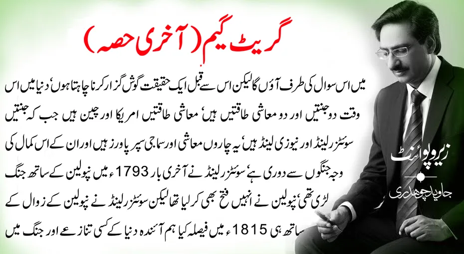 نپولین نے انہیں فتح بھی کر لیا تھا لیکن سوئٹزرلینڈ نے نپولین کے زوال کے ساتھ ہی 1815ء میں فیصلہ کیا ہم آئندہ دنیا کے کسی تنازعے اور جنگ میں شریک نہیں ہوں گے‘ ہم نیوٹرل رہیں گے چناں چہ آج دو سو گیارہ سال گزرنے کے باوجود سوئٹزرلینڈ کسی عالمی تنازع میں شامل ہوا اور نہ کوئی جنگ لڑی‘ یہ جنگ عظیم اول اور دوم میں بھی نیوٹرل رہا شاید یہی وجہ ہے سوئٹزرلینڈ میں اڑھائی سو سال پرانے سکول اور کالجز ہیں اور عالمی جنگوں کے دوران بھی متحارب ملکوں کے سربراہوں اور ارب پتیوں کے بچے ان سکولوں میں پڑھتے رہے‘ آج بھی دنیا کا سب سے مہنگا سکول سوئٹزرلینڈ میں ہے‘ اس کے دو کیمپس ہیں اور ایک بچے کی سالانہ فیس پانچ کروڑ روپے ہوتی ہے‘ دنیا کے سب سے محفوظ بینک بھی اسی ملک میں ہیں اور لیگ آف نیشنز اور اقوام متحدہ کے زیادہ تر دفاتر بھی سوئٹزرلینڈ میں ہیں۔ نیوزی لینڈ بھی جنگوں سے پاک ملک ہے‘ اس میں آخری جنگ 1845ء سے 1872ء کے درمیان لڑی گئی‘ یہ برطانوی فوجیوں اور موری قبائل کے درمیان جھڑپیں تھیں‘ اس کے بعد 1916ء میں ہلکی پھلکی جھڑپیں ہوئیں‘ اس کے بعد 1979ء میں آک لینڈ یونیورسٹی میں ہاکا پارٹی کا واقعہ پیش آیا‘ یہ چھوٹی سی لڑائی تھی جو صرف تین منٹ جاری رہی اور اسے ’’دی تھری منٹ وار‘‘ کہا جاتا ہے چناں چہ نیوزی لینڈ بھی زمین پر جنت کی حیثیت رکھتا ہے‘ آپ کبھی سوئٹزرلینڈ اور نیوزی لینڈ جا کر دیکھیں آپ جوں جوں بڑے شہروں سے نکلتے اور دیہات کی طرف بڑھتے جائیں گے آپ خود کو جنت میں محسوس کرتے جائیں گے اور اس کا سارا کریڈٹ جنگوں سے پرہیز کو جاتا ہے‘ یہ دونوں ملک اگر آج کسی تنازع یا جنگ میں شریک ہو جائیں تو ان کی جنت کو جہنم بنتے دیر نہیں لگے گی۔ چین اور امریکا بھی اس لیے سپرپاور ہیں کہ دونوں نے دوسری جنگ عظیم کے بعدکسی جنگ کو