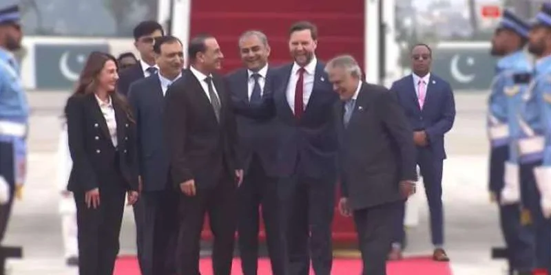 ہفتہ کوجے ڈی وینس کے ہمراہ امریکی صدر ڈونلڈ ٹرمپ کے مشیر اسٹیو وٹکوف اور داماد جیرڈ کشنر بھی اسلام آباد پہنچے ۔ نائب وزیراعظم و وزیر خارجہ اسحاق ڈار، وزیر داخلہ محسن نقوی اور فیلڈ مارشل عاصم منیر نے امریکی نائب صدر کا استقبال کیا۔امریکی نائب صدر کے طیارے نے طویل افغان کی فضائی حدود استعمال نہیں کی، ان کا خصوصی طیارہ جارجیا، آذربائیجان، ترکمانستان اور تاجکستان کے راستے پاکستان پہنچا۔جے ڈی وینس کا طیارہ 10 بجے چترال کے قریب سے پاکستانی فضائی حدود میں داخل ہوا، پاکستان کی فضائی حدود میں ائیر فورس کی جانب سے پرتپاک استقبال کیا گیا اور خصوصی طیارے نے صبح دس بجکر 33منٹ پر نورخان ائیر بیس پر لینڈ کیا۔