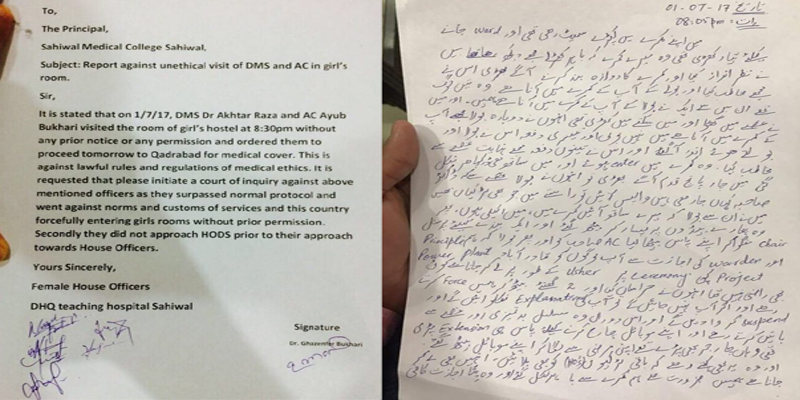 بولتے ہوئے تالے توڑ کر اندر داخل ہو گیا ۔ خواتین ڈاکٹرز میں اس واقعہ کے بعد خوف و ہراس پھیل گیا ہے ۔ساہیوال میں قادر آباد کول پاور پراجیکٹ کے دورے پر آنیوالے وی وی آئی پیزکی’’ پروٹوکول ڈیوٹی ‘‘سر انجام دینے پر دبائو ڈالتا رہا۔ اسسٹنٹ کمشنر کی اس مبینہ مذموم حرکت کا انکشاف اس وقت ہوا جب ہاسٹل کی خاتون سپرنٹنڈنٹ اور ڈاکٹر غضنفر کی جانب سے ایک شکایاتی خط لکھا گیا جس میں اس شرمناک واقعہ کی تفصیلات درج کرتے ہوئے شکایات لگائی گئی تھی۔ یہ خط ساہیوال میڈیکل کالج کے پرنسپل کی جانب لکھا گیا ہے ۔خط میں بتایا گیا ہے کہ اسسٹنٹ کمشنر ایوب بخاری اور ڈی ایم ایس ڈاکٹر اختر رضا ساڑھے 8بجے رات کو خواتین ڈاکٹرز ہاسٹل میں گھس آئے اور انہوں نے شرمناک کام کیلئے دبائو ڈالا ۔ خط میں کہا گیا ہے کہ اسسٹنٹ کمشنر اور ڈی ایم ایس کی جانب سے کی جانیوالی یہ حرکت تمام قوانین اور طبی روایات کے خلاف ہے۔بتایا جاتا ہے کہ خواتین ڈاکٹرز کے ہاسٹل میں زبردستی گھسنے کے ایک دن بعد اسسٹنٹ کمشنر آفس کی جانب سے ایک نوٹیفکیشن ہاسٹل بھیجا گیا جس میں 12خواتین ڈاکٹرز کے نام موجود ہیں جنہیں قادر آباد کول پاور پراجیکٹ میں وی وی آئی پیز کی آمد کے موقع پر