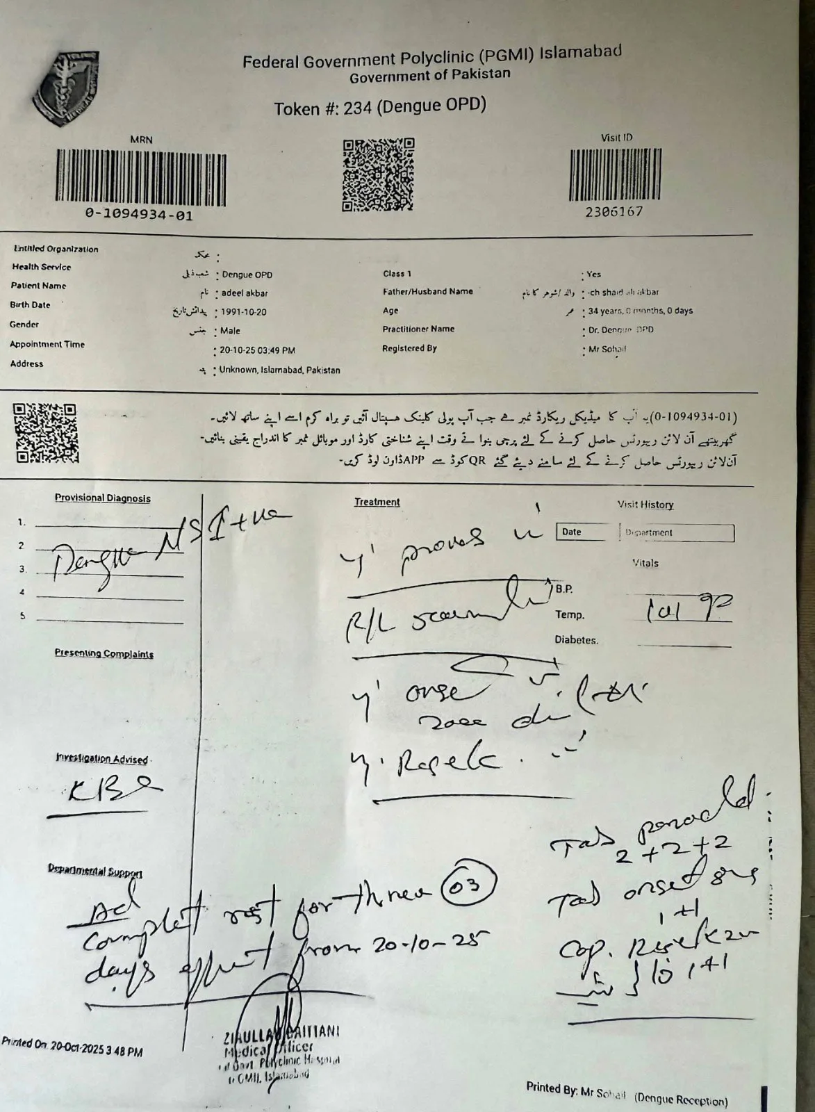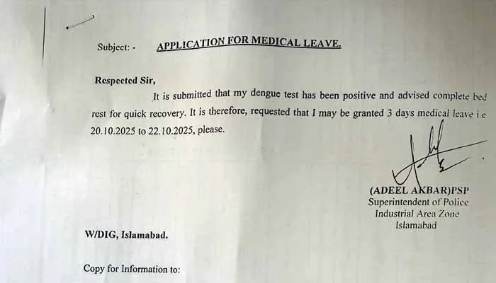 اسلام آباد (این این آئی)ایس پی عدیل اکبر کی ڈی آئی جی اسلام آباد کو چھٹی سے متعلق دی گئی درخواست اور ان کی میڈیکل رپورٹ سامنے آگئیمیڈیکل رپورٹ کے مطابق ایس پی عدیل اکبر کا ڈینگی ٹیسٹ پوزیٹو آیا تھا، انہوں نے 20 اکتوبر کو پولی کلینک سے چیک اپ کرایا تھا۔ڈینگی پوزیٹیو آنے کے بعد ایس پی عدیل اکبر نے 3 روز کی چھٹی کی درخواست دی تھی۔ ڈی آئی جی اسلام آباد نے ان کی چھٹی منظور کر لی تھی۔ذرائع کے مطابق عدیل اکبر نے میڈیکل چھٹی کے بعد 23 اکتوبر کو دوبارہ ڈیوٹی جوائن کی تھی۔ پولیس ذرائع نے کہا کہ عدیل اکبر کا بیرون ملک یونیورسٹی میں داخلہ ہو چکا تھا، وہ دفتر خارجہ دستاویزات کی تصدیق کے لیے بھی گئے تھے، قوی امکان ہے کہ عدیل اکبر سے ایس ایم جی گن حادثاتی طور پر چلی ہو۔پولیسنگ ماہرین کے مطابق حادثے میں ایس ایم جی گن کے شاٹ کا 65 ڈگری اینگل ہے، پی ایس پی افسران ایس ایم جی گن استعمال سے زیادہ ماہر نہیں ہوتے۔