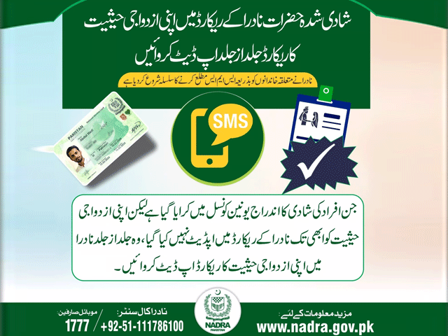 شہریوں کی سہولت کے لیے نادرا نے ایک ایس ایم ایس سروس بھی متعارف کرائی ہے، جس کے ذریعے شادی شدہ افراد کو اپنے ریکارڈ کی تازہ کاری سے متعلق معلومات فراہم کی جائیں گی۔