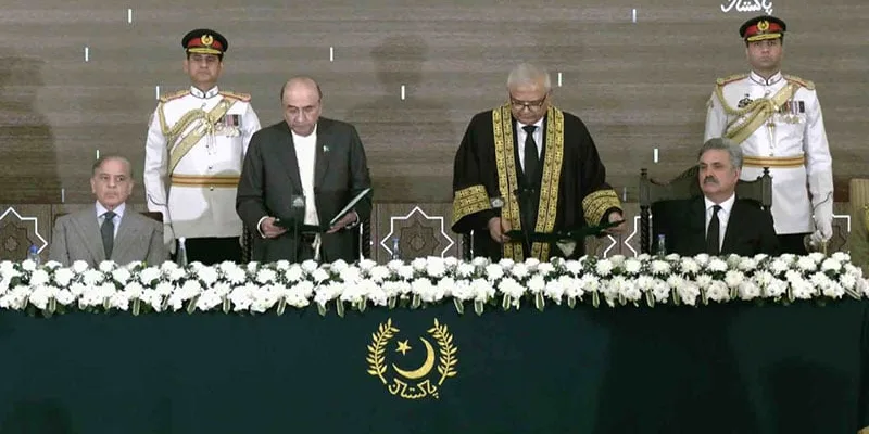 حلف برداری کی تقریب میں فیلڈ مارشل عاصم منیر،چیئرمین جوائنٹ چیف آف اسٹاف کمیٹی ساحر شمشاد اور وزیراعظم شہباز شریف شریک ہوئے۔ چیف جسٹس پاکستان یحییٰ آفریدی بھی شریک ہوئے۔چیف جسٹس پاکستان یحییٰ آفریدی، وفاقی آئینی عدالت کے سربراہ جسٹس امین الدین خان، وزیراعظم شہباز شریف اور صدر مملکت اکھٹے حلف برداری کی تقریب کیلئے ہال میں پہنچے جبکہ فیلڈ مارشل عاصم منیر اور جوائنٹ چیف آف اسٹاف کمیٹی اکھٹے ہال میں آئے۔