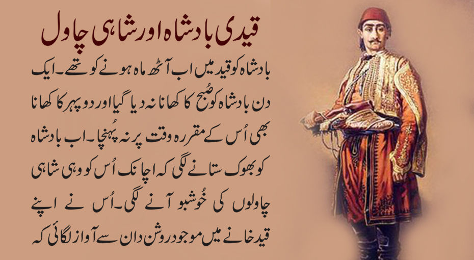 زندگی پھر سے رواں دواں ہو گئی۔مگر یہاں قیدی بادشاہ اپنے شب و روز یہ سوچنے میں لگانے لگا کہ آخر اُس سے کہاں ایسے کوئی غلطی یاں گُناہ ہوا ہے جس کی سزا مل رہی ہے۔بادشاہ قید خآنے میں بھی اللہ کا شُکر ادا کر رہا تھا۔اُس کا کھانا بھی وقت پر پُہنچ جاتا تھا۔لیکن جب دُوپہر کے کھانے کا وقت ہوتا تو اُس کو شاہی چاولوں کی خُوشبو آنے لگتی۔وہ سوچتا شاید آج اُس کے لیئے شاہی کھانا آنے والا ہے مگر کھانا آتا تو وہی قیدیوں والا۔وہ سمجھ نہیں پاتا تھا کہ آخر یہ خُوشبو کہاں سے آتی ہے۔بادشاہ کو قید میں اب آٹھ ماہ ہونے کو تھے۔ایک دن بادشاہ کوصُبح کا کھانا نہ دیا گیااور دوپہر کا کھانا بھی اُس کے مقررہ وقت پر نہ پُہنچا۔اب بادشاہ کو بھوک ستانے لگی کہ اچانک اُس کو وہی شاہی چاولوں کی خُوشبو آنے لگی۔اُس نے اپنے قیدخانے میں موجود روشن دان سے آواز لگائی کہ اگر کوئی اللہ کا بندا اُس طرف ہے تو مُجھ کو کھانے کو کچھ دے میں بھوکا ہوں۔قیدخانے کے باہر ایک آدمی تھا۔اُس نے کپڑے کے اندر کچھ کھانا باندھ کر روشن دان سے اندر پھینک دیا۔جب بادشاہ نے کپڑا کھولا تو اُس کو تعاجب ہوا کہ یہ تو وہی شاہی چاول ہیں جس کی خُوشبو روز اُس کو آتی تھی۔ بادشاہ نے فورا پوچھا کہ آپ کون ہیں?دیوار کے اُس پار سے آواز آئی کے میں اک فقیر ہوں اور روز بھیک مانگنے کے لیئے یہیں بیٹھتا ہوں۔