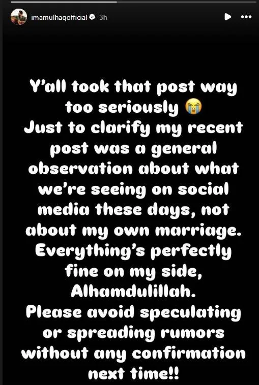 ان کی ازدواجی زندگی کے حوالے سے پھیلنے والی باتیں بے بنیاد ہیں۔حال ہی میں امام الحق نے انسٹاگرام پر ایک سٹوری شیئر کی تھی جس میں انہوں نے موجودہ دور میں شادی کو مشکل قرار دیا تھا، جس کے بعد صارفین نے اسے ان کی ذاتی زندگی سے جوڑ کر مختلف قیاس آرائیاں شروع کر دیں۔اب اپنی نئی پوسٹ میں انہوں نے ان تمام افواہوں کی تردید کرتے ہوئے وضاحت دی کہ ان کا بیان عمومی سماجی حالات پر ایک رائے تھا، نہ کہ ان کی اپنی شادی سے متعلق کوئی اشارہ۔انہوں نے کہا کہ ان کی ذاتی زندگی میں سب کچھ ٹھیک ہے اور مداح بلا تصدیق ایسی باتوں کو پھیلانے سے اجتناب کریں۔